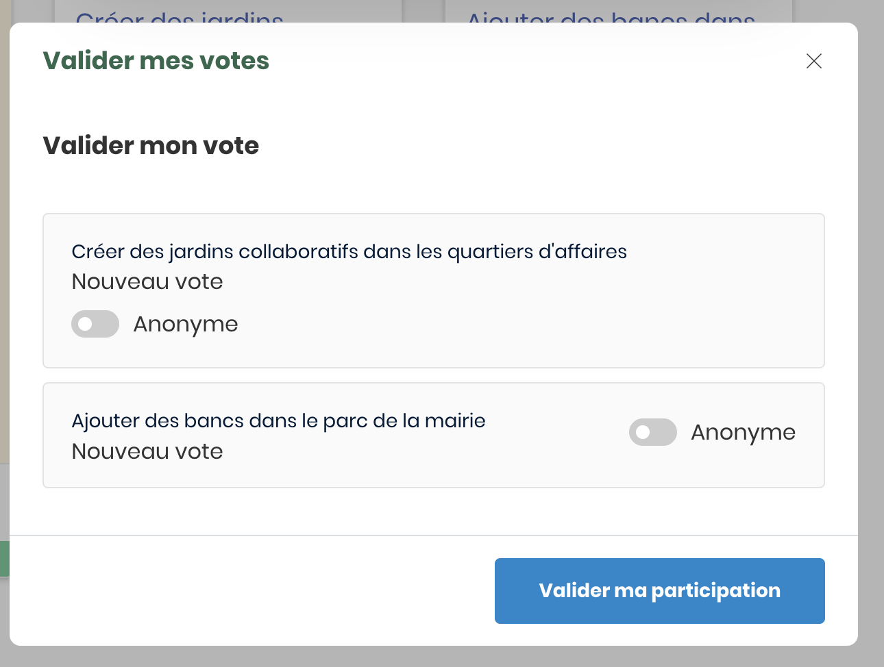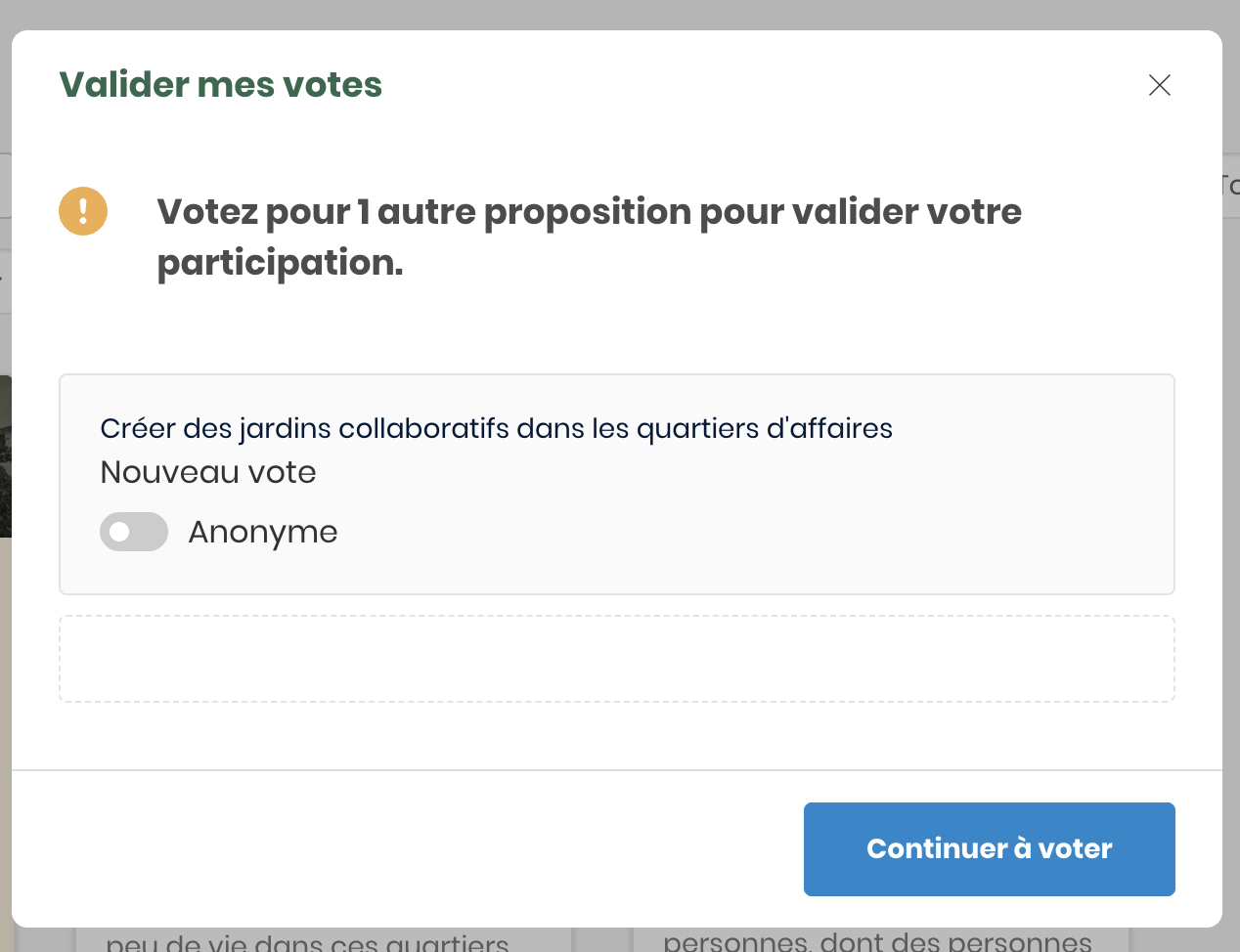 Si vous voyez un bouton Voter pour sur les propositions d'un projet participatif, c'est que vous pouvez voter pour soutenir vos propositions préférées.